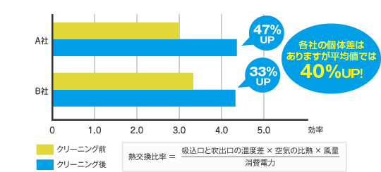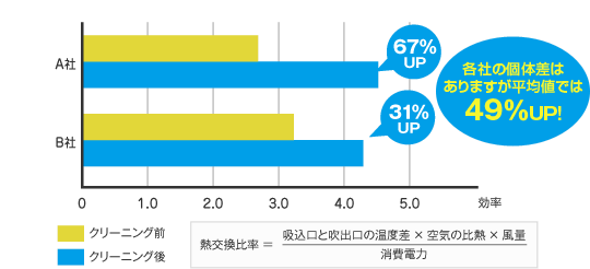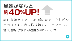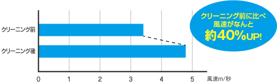エアコンを入れて1分間の平均風速が2.7m/秒から3.1m/秒に。これはカビ、ホコリなどによるエアコンの負担やロスがカットされた為。効率がよくなると、電気代の節約や故障の軽減にもなる。 |