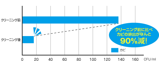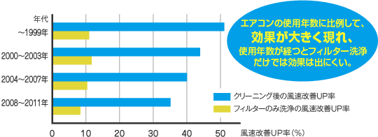 エアコンを入れて1分間の平均風速が2.7m/秒から3.1m/秒に。これはカビ、ホコリなどによるエアコンの負担やロスがカットされた為。効率がよくなると、電気代の節約や故障の軽減にもなる。 |
