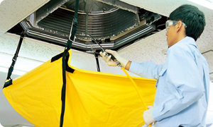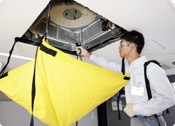 隅々までホコリを除去! エアコンにたまったホコリを、バキュームを使用し除去します。 |