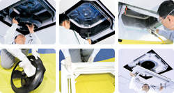 | 洗剤分を残さないよう、高圧水でしっかりすすぎます。 | 外装パネルも丁寧に汚れを除去します。 | 熱交換器やフィルターなど、ひとつひとつに抗菌・防カビ処理を施し、仕上げます。 |