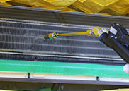 細部の汚れをチェック! 熱交換器のカビやホコリを専用の資器材と薬剤で高圧洗浄します。 |