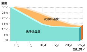 | 室内を30℃から20℃にする場合。 おそうじ前は約13分30秒かかっていたのが、おそうじ後はわずか5分でクールに。 |