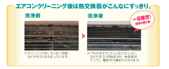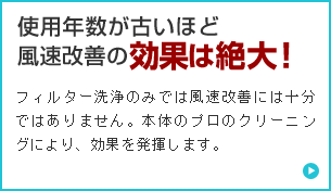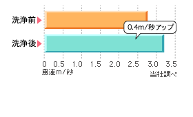 エアコンを入れて1分間の平均風速が2.7m/秒から3.1m/秒に。これはカビ、ホコリなどによるエアコンの負担やロスがカットされた為。効率がよくなると、電気代の節約や故障の軽減にもなる。 |